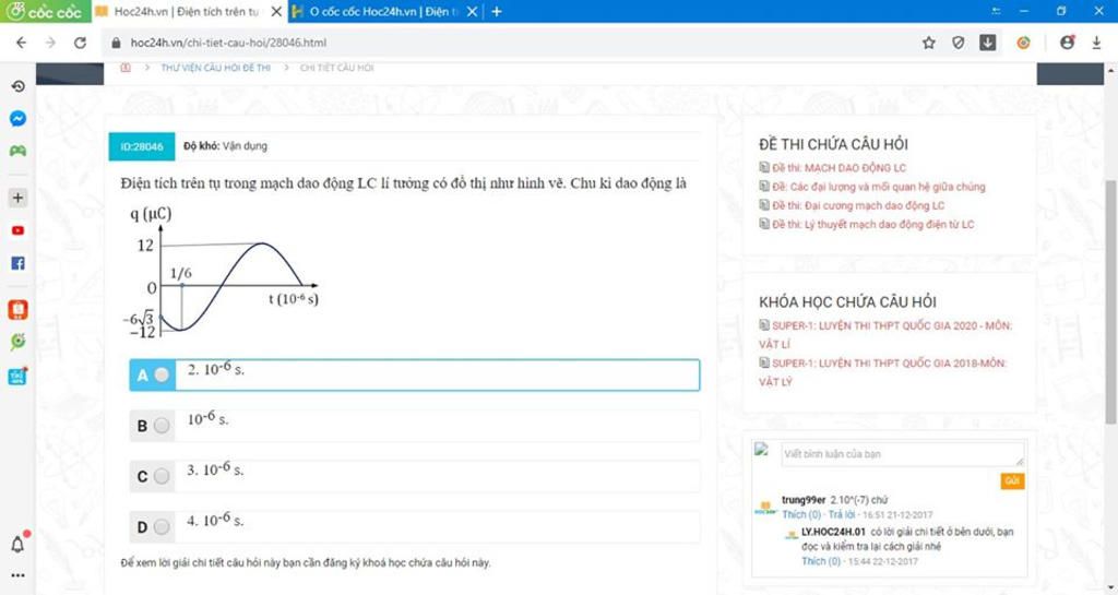 \[t = \frac{T}{{12}} = \frac{1}{6}{.10^{ - 6}} \Rightarrow T = {2.10^{ - 6}}s\]