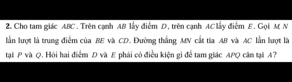 2. Cho tam giác ABC. Trên cạnh AB lấy điểm D, trên cạnh AC lấy điểm E. Gọi M, N