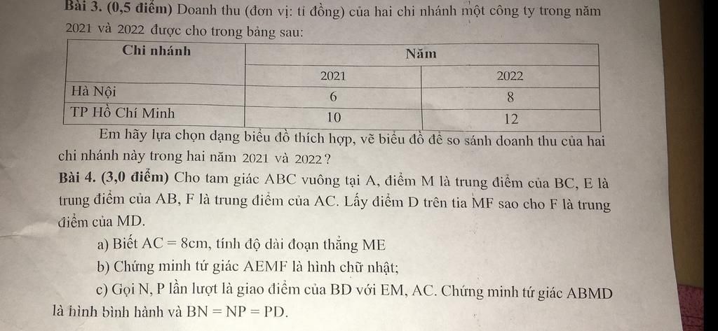 Bài 3. (0,5 điểm) Doanh thu (đơn vị: tỉ đồng) của hai chi nhánh một công ty trong năm