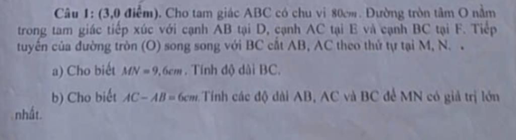 Câu 1: (3,0 điểm). Cho tam giác ABC có chu vi 80cm . Đường tròn tâm O nằm