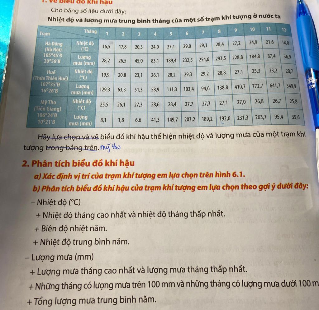 Phân tích biểu đồ (trạm khí tượng Mỹ Tho): $\\$`-` Nhiệt độ $\rm(^\circ C)$$\\$ `+` Nhiệt độ tháng cao nhất: $\rm28,6^\circ C$ (tháng `4`) $\\$`+` Nhiệt độ tháng thấp nhất: $\rm25,5^\circ C$ (tháng `1`). $\\$`+` Biên độ nhiệt năm: $\rm3,1^\circ C$ $\\$`+` Nhiệt độ trung bình năm: $\rm 27,0^\circ C$ $\\$`-` Lượng mưa `(mm):` $\\$`+` Lượng mưa tháng cao nhất: $263,7\,mm$ (tháng $10$). $\\$`+` Lượng mưa tháng thấp nhất: $1,8\,mm$ (tháng $2$). $\\$`+` Những tháng có lượng mưa trên $100\, mm$: tháng $1,2,3,4,11,12$ $\\$`+` Những tháng có lượng mưa dưới $100\, mm$: tháng $5,6,7,8,9,10$ $\\$`+` Tổng lượng mưa trung bình năm: $1\,418,5\,mm$