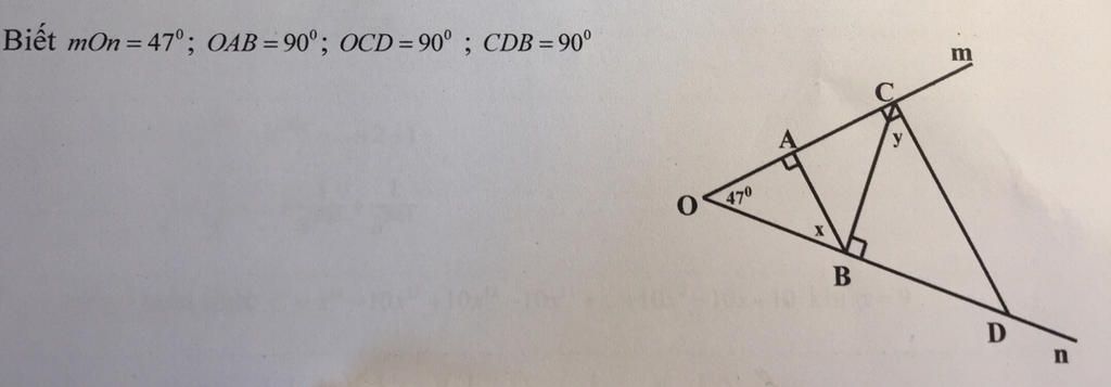 Thay `\hat{O} = 47^o` (gt) và `\hat{OAB} = 90^o` vào (1) ta được :