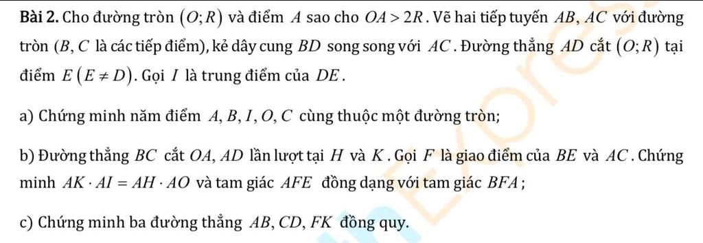 Bài 2. Cho đường tròn (O;R) và điểm A sao cho OA>2R. Vẽ hai tiếp tuyến AB, AC với đường