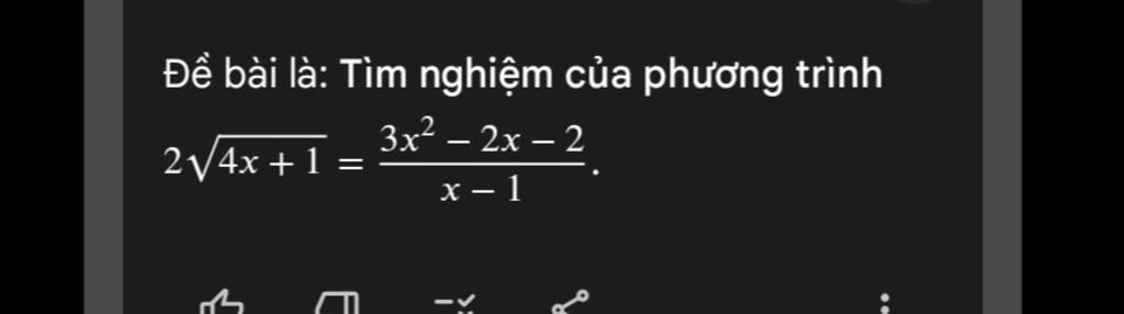 `2\sqrt{4x + 1} = ( 3x^2 - 2x - 2)/( x - 1 )` ĐKXĐ `x >= -1/4 ; x \ne 1`