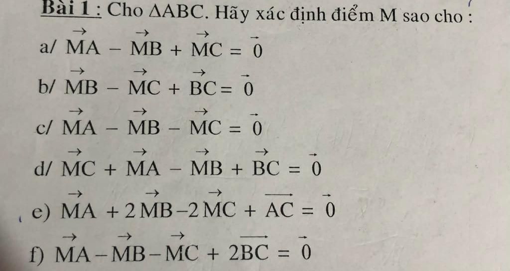 $\Leftrightarrow \overrightarrow{MA} + \overrightarrow{BM} - \overrightarrow{MC} = \overrightarrow{0}$
