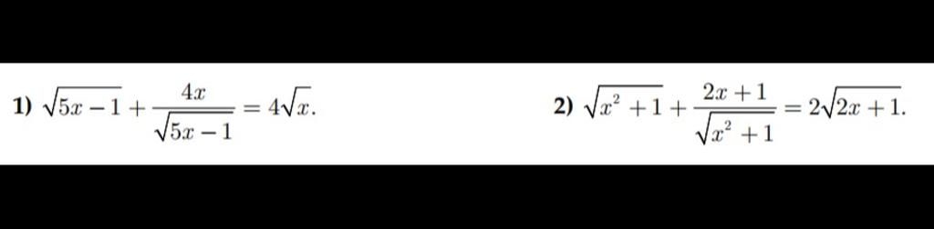 `1) \sqrt{5x - 1} + ( 4x )/( \sqrt{5x - 1} ) = 4\sqrt{x}` ĐKXĐ `x > 1/5`