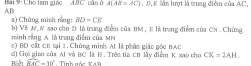 Bài 9: Cho tam giác ABC cân ở A(AB = AC). D,E lần lượt là trung điểm của AC,
