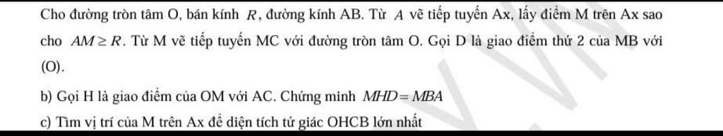 Cho đường tròn tâm O, bán kính R, đường kính AB. Từ A vẽ tiếp tuyến Ax, lấy điểm M trên Ax sao