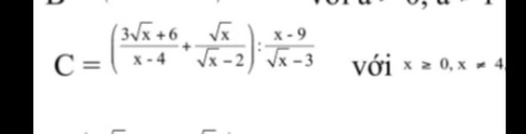 `C=((3\sqrt{x}+6)/(x-4)+(\sqrt{x})/(\sqrt{x}-2)):(x-9)/(\sqrt{x}-3)`