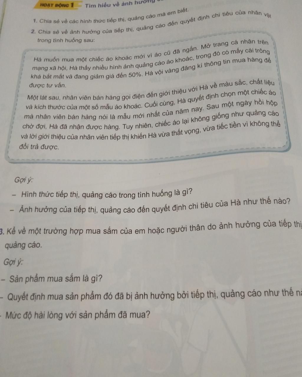 2. Chia sẻ về ảnh hưởng của tiếp thị, quảng cáo đến quyết định chi tiêu của nhân trong tình huống sau: Hà muốn mua một chiếc áo khoác mới vì áo cũ đã ngắn. Mở trang cá nhân trên mạng xã hội, Hà thấy nhiều hình ảnh quảng cáo áo khoác, trong đó có mấy cái trông khá bắt mắt và đang giảm giá đến 50%. Hà vội vàng đăng kí thông tin mua hàng để được tư vấn. Một lát sau, nhân viên bán hàng gọi điện đến giới thiệu với Hà về màu sắc, chất liệu và kích thước của một số mẫu áo khoác. Cuối cùng, Hà quyết định chọn một chiếc áo mà nhân viên bản hàng nói là mẫu mới nhất của năm nay. Sau một ngày hồi hộp chờ đợi, Hà đã nhận được hàng. Tuy nhiên, chiếc áo lại không giống như quảng cáo và lời giới thiệu của nhân viên tiếp thị khiến Hà vừa thất vọng, vừa tiếc tiền vì không thể đổi trả được.