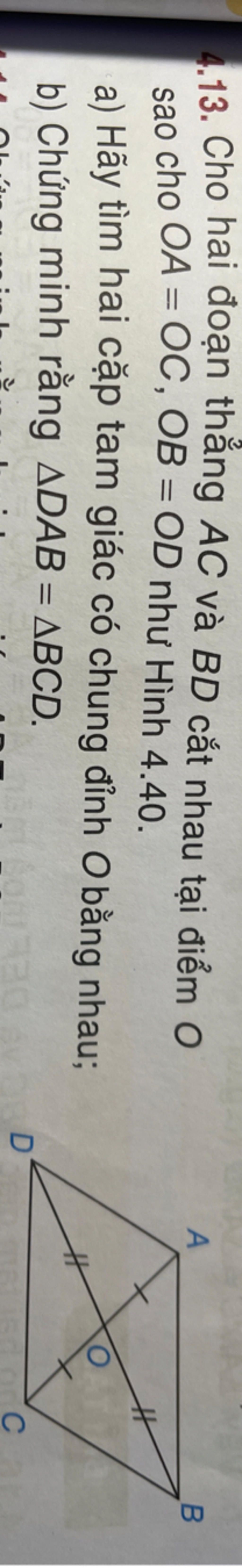 \begin{array}{|}\hline \text{GT|}&\text{OA=OC và OB=OD và AC với BD cắt nhau tại O}&\\\hline \text{KL|}&\text{ΔDAB = ΔBCD và ΔAOD = ΔCOB và ΔDOC = ΔBOA}&\\\hline\end{array}