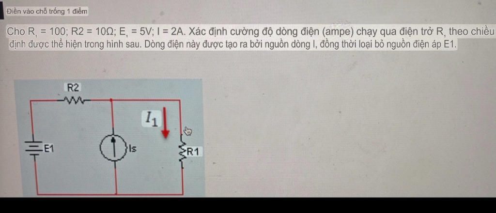 Cho R, = 100; R2 = 10Q; E = 5V; I = 2A. Xác định cường độ dòng điện (ampe) chạy qua điện trở R, theo chiều