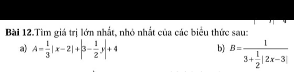 `Dấu = xảy ra: {( 1/3| x - 2 | = 0 ),( | 3 - 1/2y | = 0 ):}`