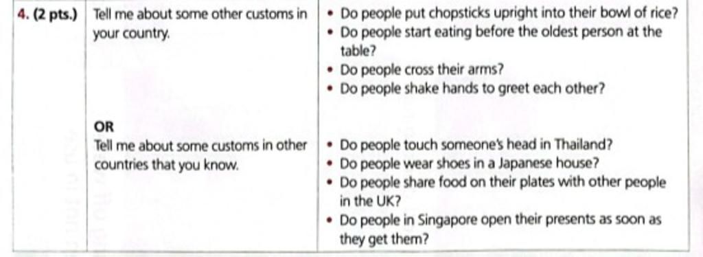 ⇒ In my country, people don’t put chopsticks upright in a bowl of rice because it’s impolite. We also don’t start eating before the oldest person at the table. People don’t cross their arms when talking because it looks rude, and we usually shake hands when we meet each other. I think these customs are important because they show respect.