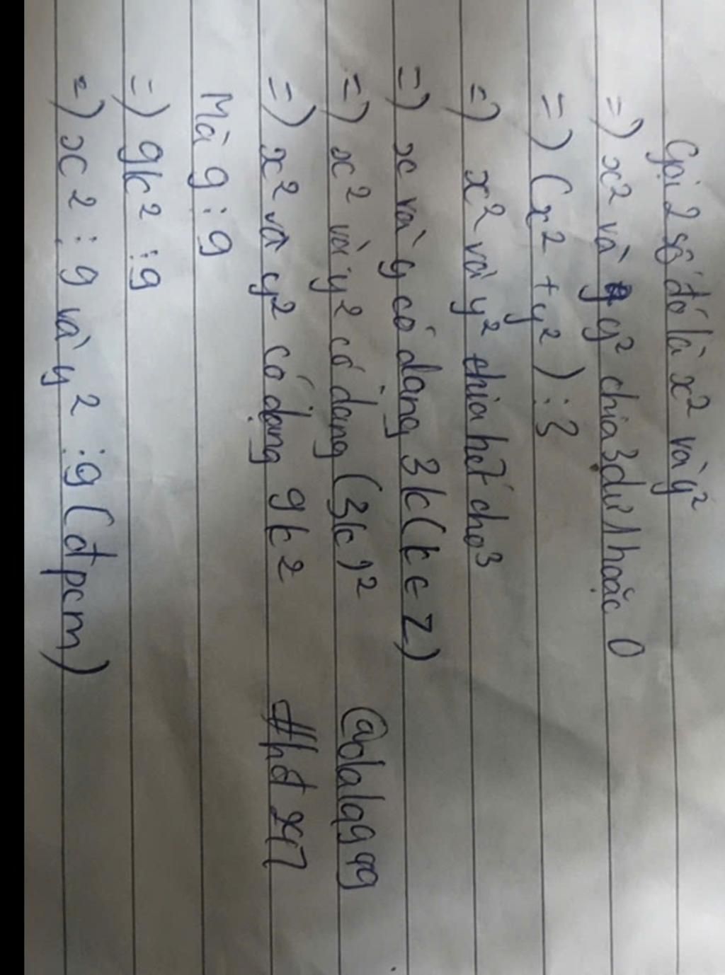⇒ Để `a^2 + b^2 \vdots 3` thì `a^2 \vdots 3` và `b^2 \vdots 3` mà 3 là số nguyên tố
