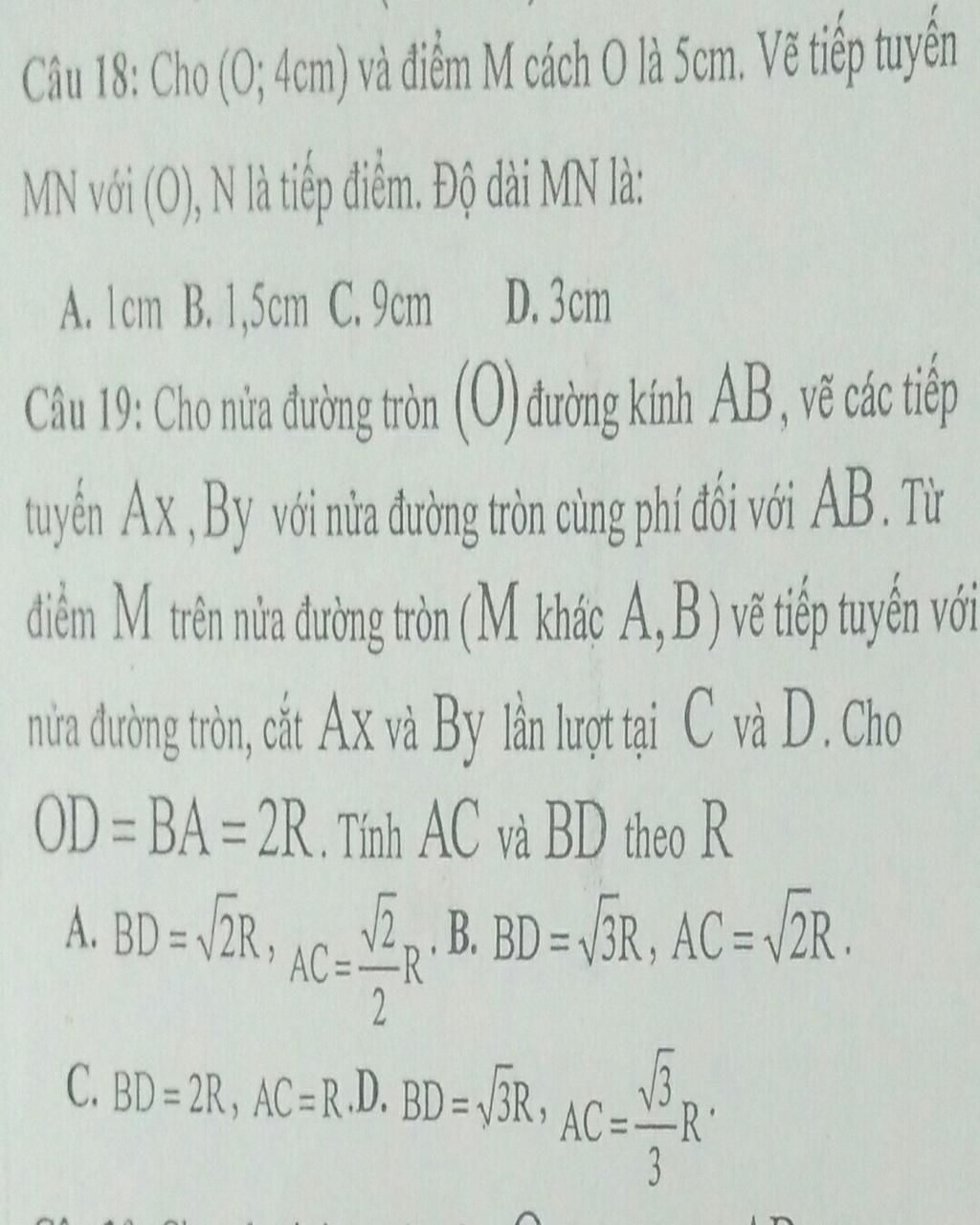Cho (O;4cm) và điểm M cách O là 5cm.Vẽ tiếp tuyến MN với (O), N là tiếp điểm. Độ dài MN là