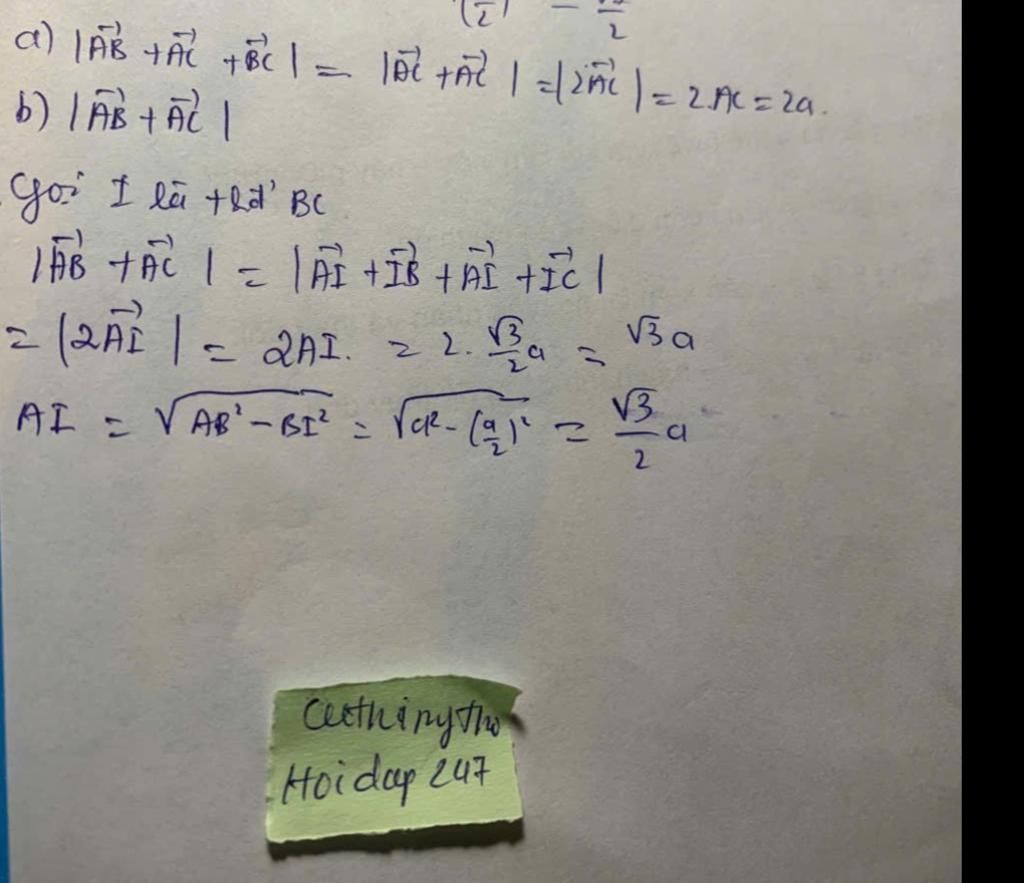 Cho tam giác đều ABC cạnh a. Tínha) | `\vec{AB}+``\vec{AC}+``\vec{BC}` |b) | `\vec{AB}+``\vec{AC}` |