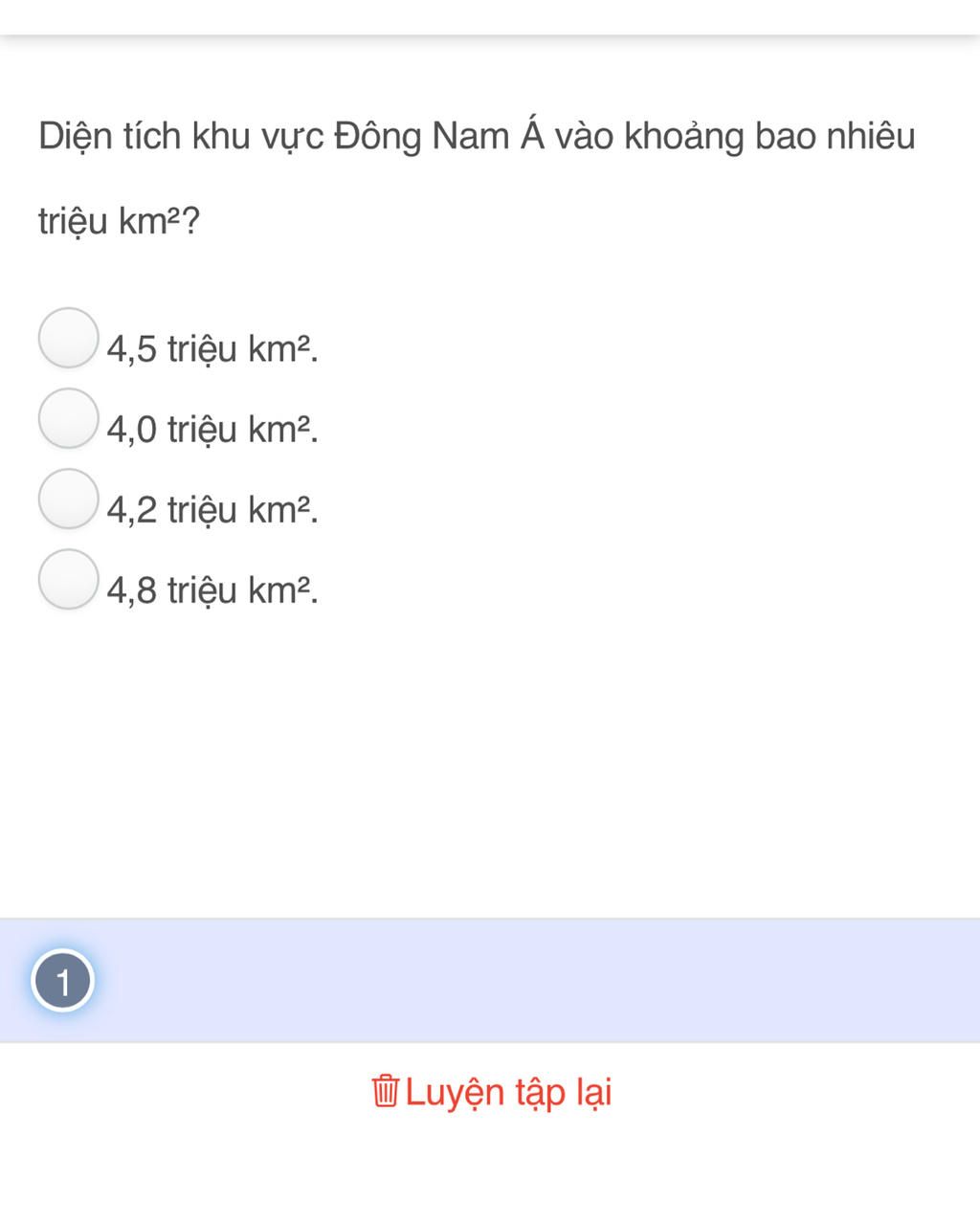`\color{lightblue}{\text{A. 4,5 triệu km² }}`