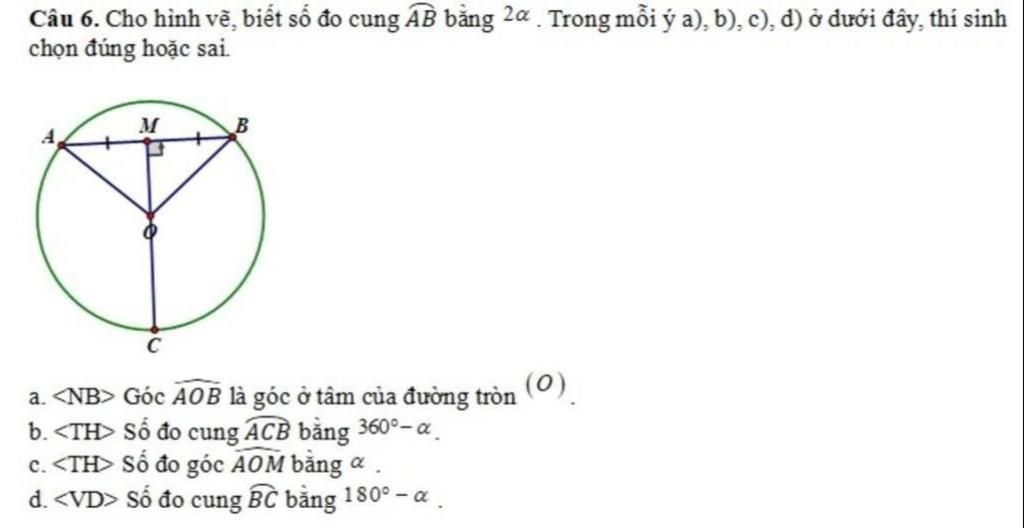 Câu 6. Cho hình vẽ, biết số đo cung AB bằng 2a . Trong mỗi ý a), b), c), d) ở dưới đây, thí sinh