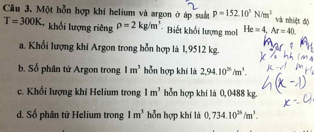 Câu 3. Một hỗn hợp khí helium và argon ở áp suất P=152.10* N/m3