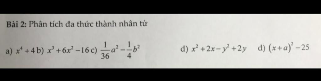 `c)1/36 a^{2]- 1/4b^{2}=(1/6a)^{2}-(1/2b)^{2}=(1/6a-1/2b).(1/6a+1/2b)`