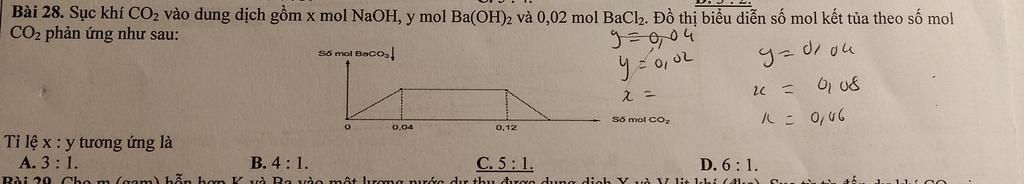 Bài 28. Sục khí CO2 vào dung dịch gồm x mol NaOH, y mol Ba(OH)2 và 0,02 mol BaCl2. Đồ thị biểu diễn số mol kết tủa theo số mol