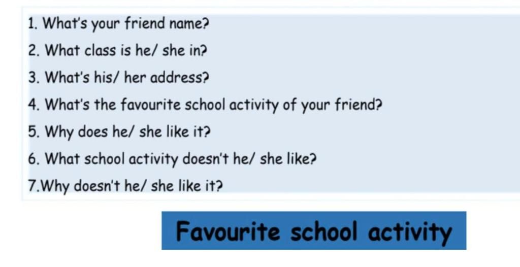 4. His/Her favourite school activity is _______ (Điền hoạt động yêu thích bạn của bạn, vd như: reading, playing football, painting, singing,...)