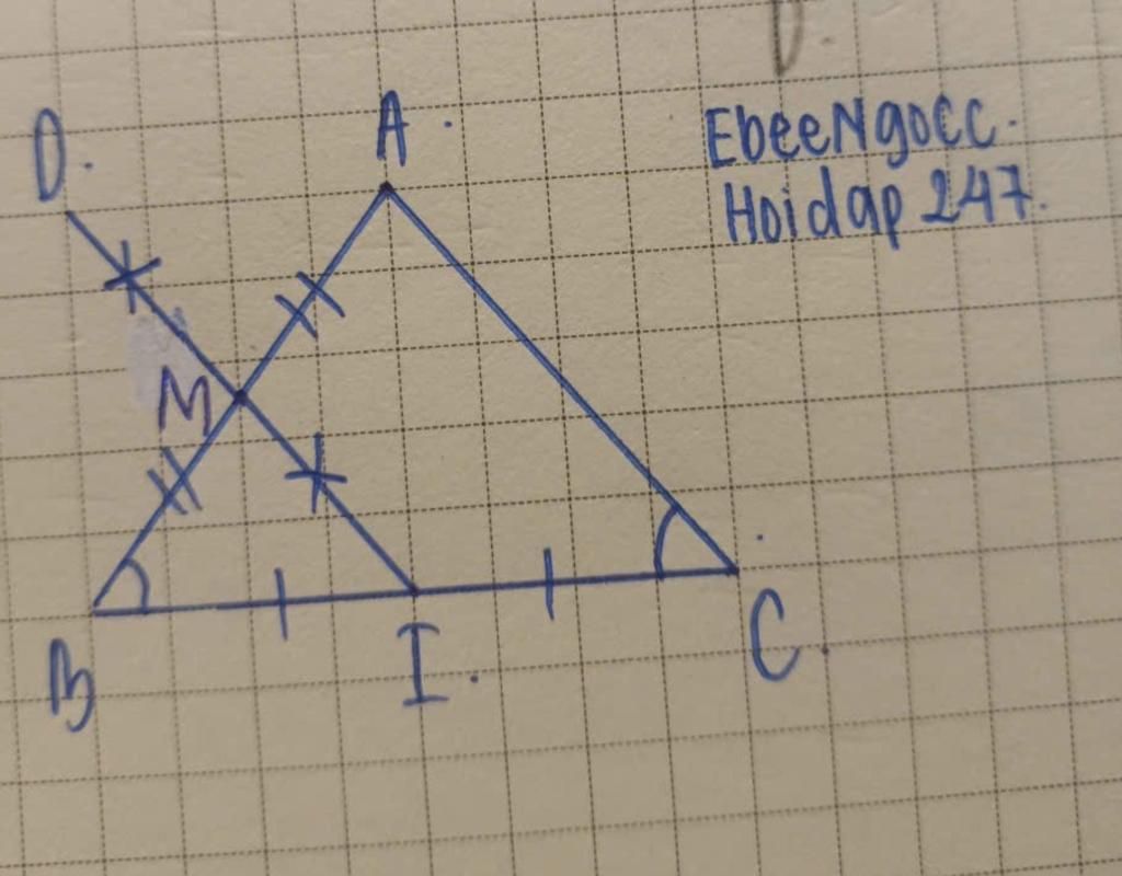 Cho tam giác ABC cân tại A. Gọi I, M lần lượt là trung điểm của các cạnh BC và AB. Gọi D là điểm đối xứng với I qua M.