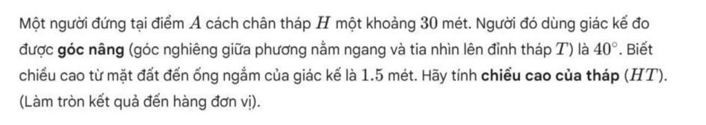 Gọi chiều cao của tháp là $HT$.Gọi vị trí mắt người là $M$, vị trí chân người là $A$.Kẻ đường thẳng nằm ngang từ mắt người $M$ vuông góc với tháp tại điểm $K$.Khi đó, ta có hình chữ nhật $AHKM$ với các tính chất: