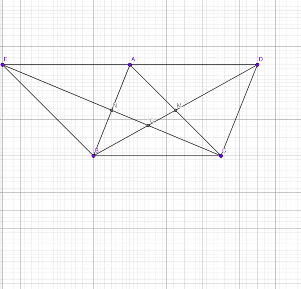 cho tam giác abc có hai đường trung tuyến bm và cn trên các tia đối của tia mb và nc lấy theo thứ tự hai điểm d và e sao cho md = mb và ne = nc.
