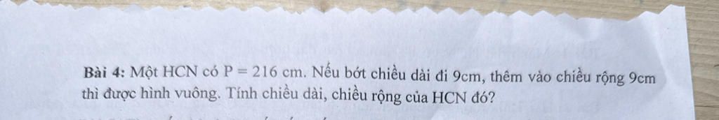 Nửa chu vi hình chữ nhật là: `216:2 = 108 (cm)`