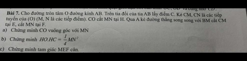 Bài 7. Cho đường tròn tâm O đường kính AB. Trên tia đối của tia AB lấy điểm C. Kẻ CM, CN là các tiếp
