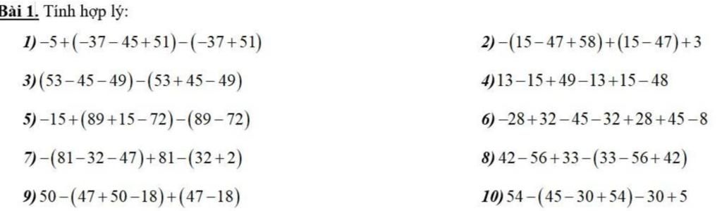 `1) -5 + (-37 - 45 + 51) - (-37 + 51)= -5 - 37 - 45 + 51 + 37 - 51= -5 - 45 + (-37 + 37) + (51 - 51)= -50`