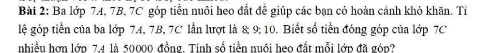 Tỉ lệ góp tiền của ba lớp `7A;7B;7C` lần lượt là `8;9;10`: