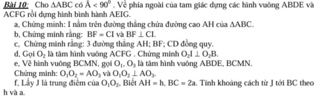 Bài 10 : Cho AABC có A < 90° . Về phía ngoài của tam giác dựng các hình vuông ABDE và