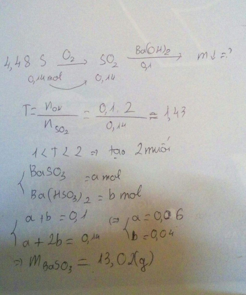 Đốt cháy hoàn toàn 4,48g lưu huỳnh rồi cho sản phẩm cháy hấp thụ hoàn toàn vào 200ml dung dịch Ba(OH)2 0,5M. Lượng chất kết tủa thu được sau phản ứng là: