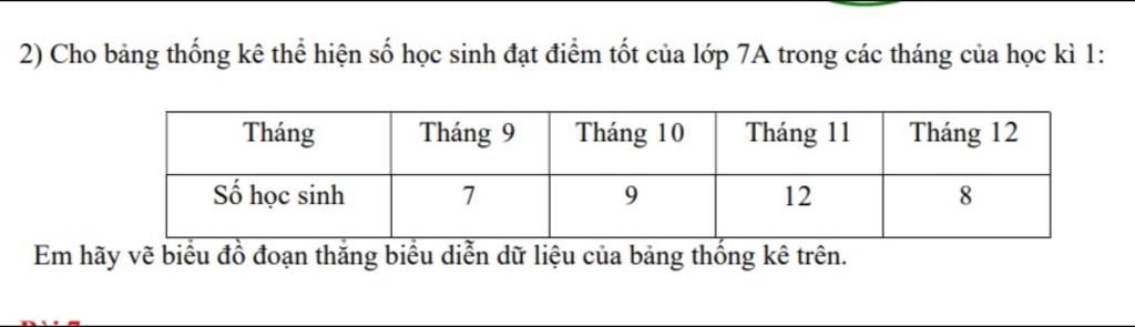 2) Cho bảng thống kê thể hiện số học sinh đạt điểm tốt của lớp 7A trong các tháng của học kì 1: