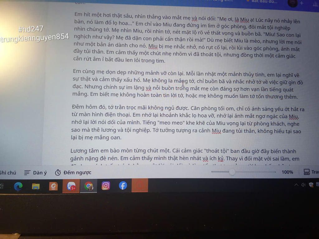 Bỗng dưng, có một tập phim gay cấn khiến em hào hứng hẳn lên. Em reo hò, vung tay múa chân theo nhịp điệu của bộ phim. Không để ý, cánh tay em vung quá mạnh, đập vào chiếc bàn nơi lọ hoa đang đứng. Em cảm nhận thấy một lực va chạm, rồi... "Rầm!" Một âm thanh kinh hoàng xé tan bầu không khí yên tĩnh của căn phòng.
