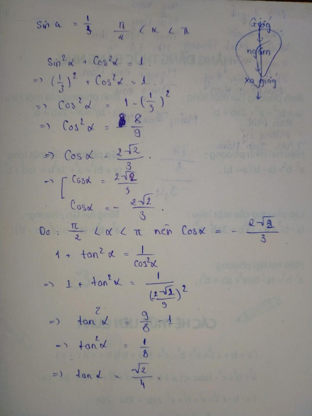 cosa =- √( 1² - sin²a) = -√(1-1/9) = -2√2/3