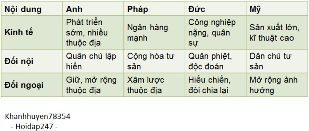 hãy lập bảng so sánh (điểm giống nhau và khác nhau) về kinh tế ,chính sách đối ngoại ,đối nội nổi bật của các đế quốc Anh, Pháp, Đức, Mỹ