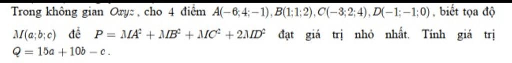 Chèn điểm `=> P = 4MI^2 + 2vec(MI) (vec(IA) + vec(IB) + vec(IC) + 2vec(ID)) + IA^2 + IB^2 + IC^2 + 2ID^2`