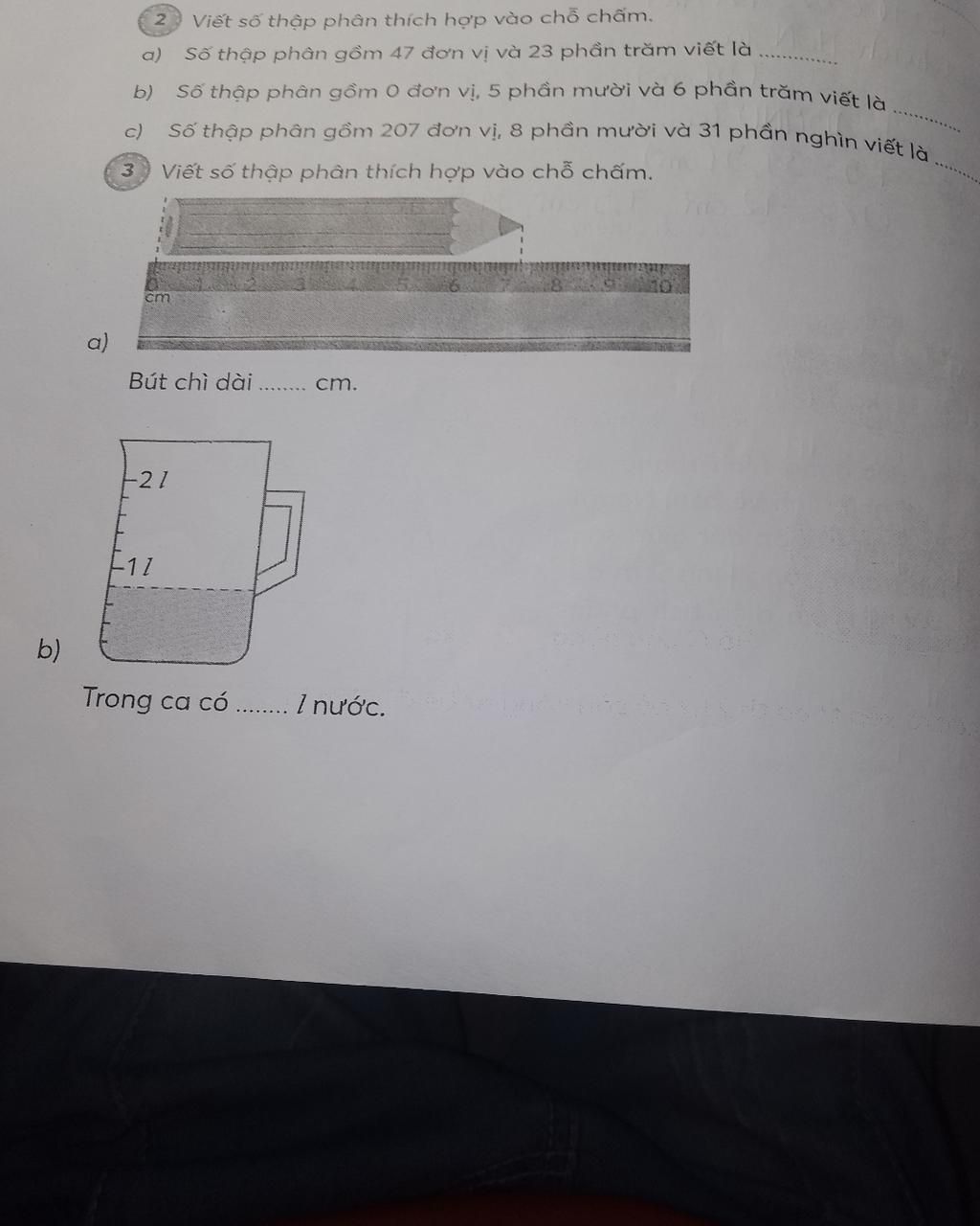 `a,` Số thập phân gồm `47` đơn vị và `23` phần trăm được viết là: `47,23`
