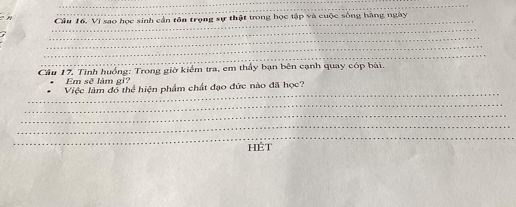 `-`Trong giờ kiểm tra, em sẽ không quay cóp bài và cũng không bao che cho bạn. Sau giờ kiểm tra, em có thể nhắc nhở, khuyên bạn nên học tập trung thực hơn