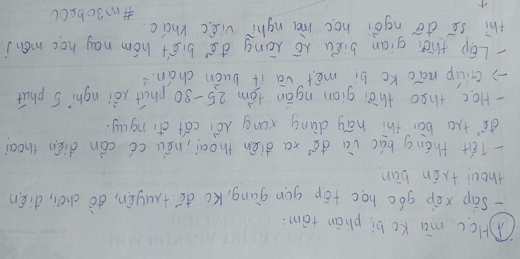 `-` Tắt tất cả các ứng dụng mạng xã hội,tập trung học bài,làm bài tập (nếu cần mxh để tra cứu trong học tập,hãy tra,sau đó tắt ngay lập tức để tránh bị phân tâm dẫn đến việc dành thời gian ảo trên mxh và quên béng việc học)