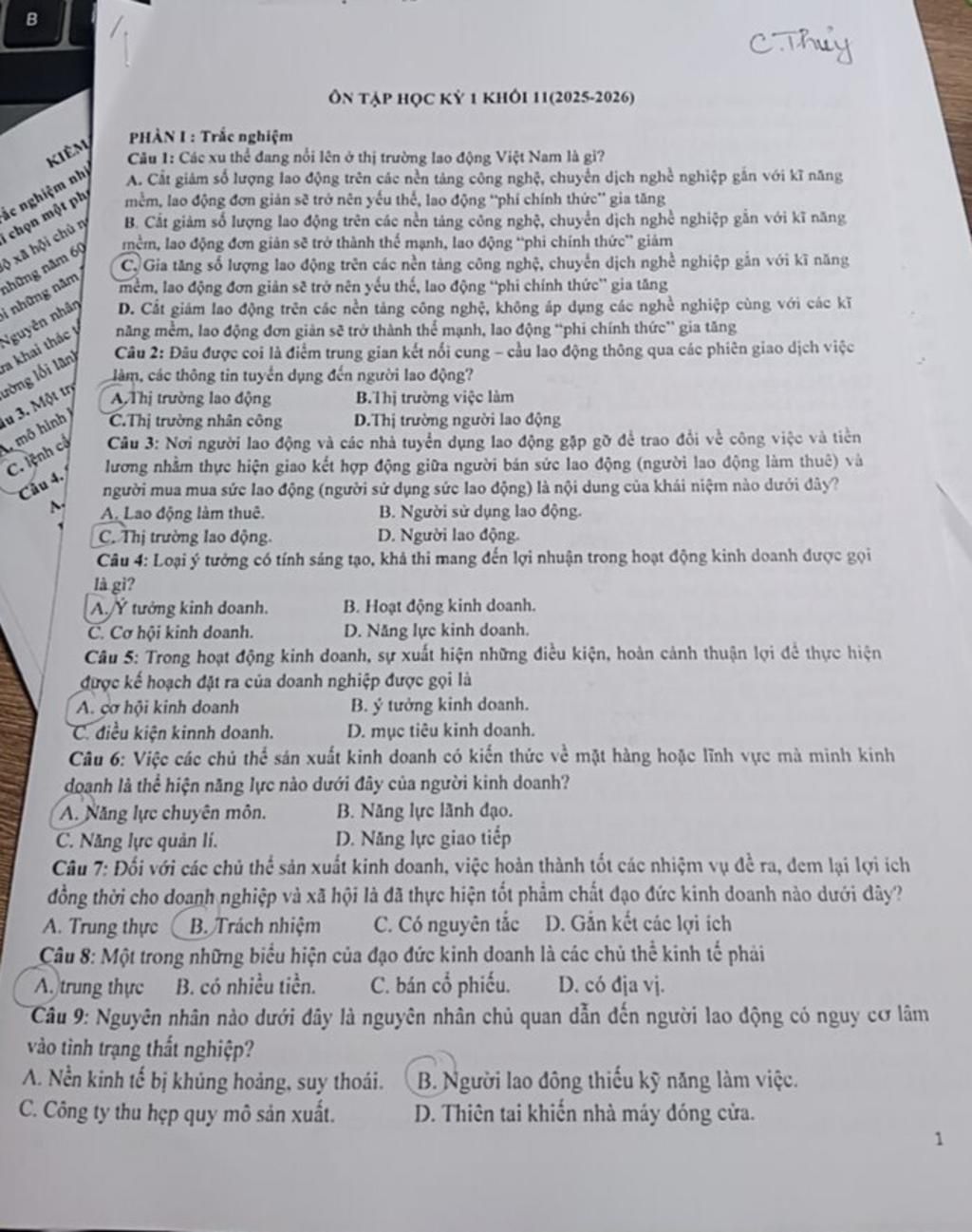 Câu 9: Nguyên nhân nào dưới đây là nguyên nhân chủ quan dẫn đến người lao động có nguy cơ lâm vào tình trạng thất nghiệp?