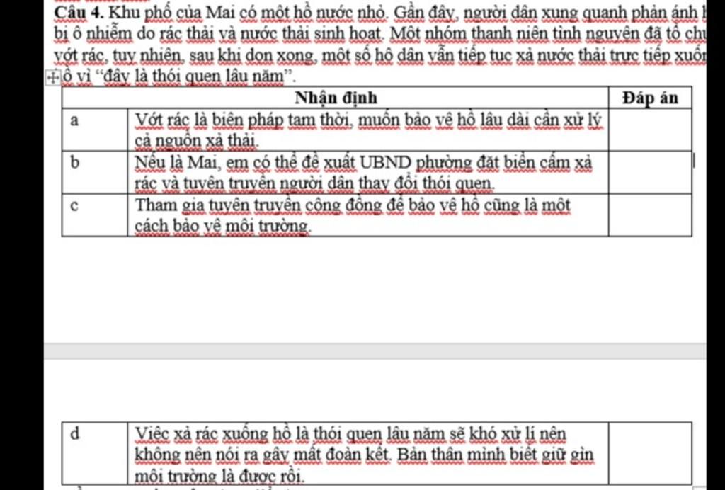 `d:` Đây là quan điểm sai trái, thể hiện thái độ thờ ơ, vô trách nhiệm. Bảo vệ môi trường là trách nhiệm chung của mọi người, không phải việc của riêng ai