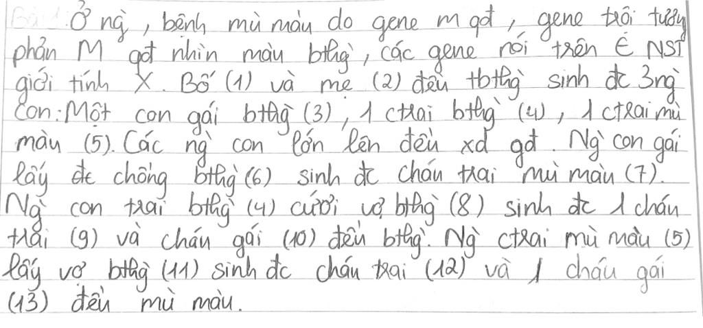 Còn người con gái số `10` và mẹ số `8` bình thường nên sẽ có thể có kiểu gene `X^MX^M` hoặc `X^MX^m.`