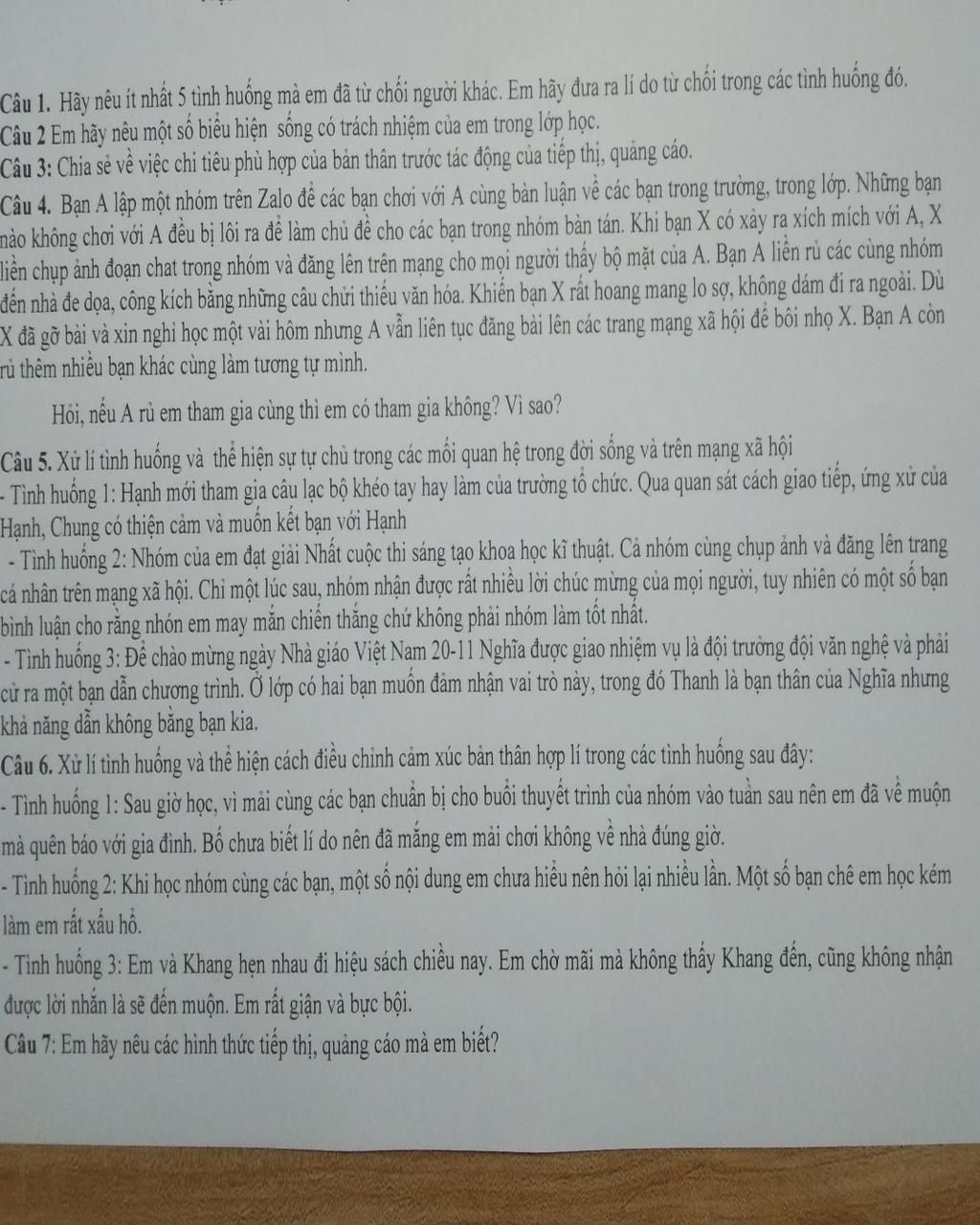 Câu 1. Hãy nêu ít nhất 5 tình huống mà em đã từ chối người khác. Em hãy đưa ra lí do từ chối trong các tình huống đó.