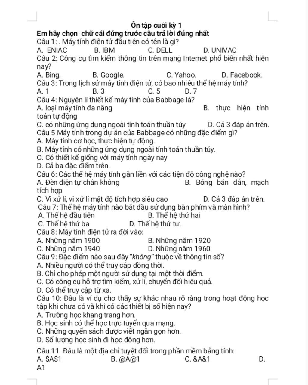 Câu 1: máy tính đầu tiên có tên là: ENIAC(Electronic Numerical Integrator and Computer) (A)