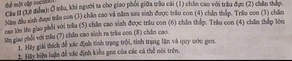 Câu II (3,0 điểm): Ở trâu, khi người ta cho giao phối giữa trâu cái (1) chân cao với trâu đực (2) chân thấp.